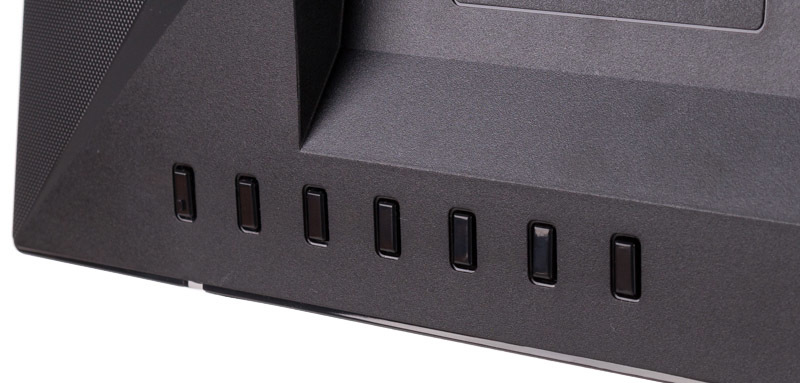 Auf dem Frontrahmen des ASUS PB27UQ befinden sich sechs Punkte, die auf die Tasten zur Steuerung hinweisen. Diese sind aber auf der Rückseite, so dass mit der Hand um den Rahmen gegriffen werden muss. Es handelt sich um mechanische Tasten, die einen angenehmen Druckpunkt besitzen und ein dezentes Klickgeräusch bei einem Druck abgeben.