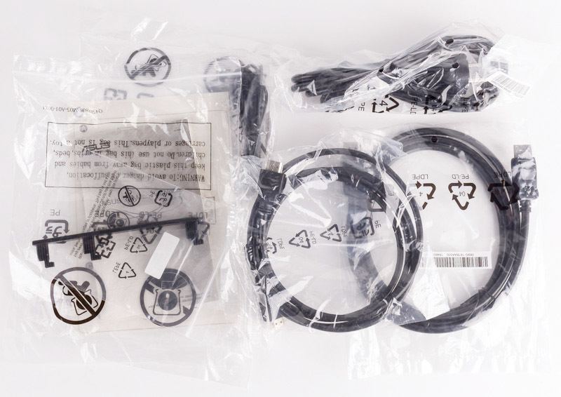 Der Lieferumfang besteht aus je einem HDMI-, DisplayPort-, Audio- und Stromkabel. Beigefügt wurden außerdem eine kleine Abdeckung, eine Kurzanleitung und die Garantiebestimmungen. Das vollständige Handbuch sowie die Treiber müssen von der Homepage des Herstellers heruntergeladen werden.