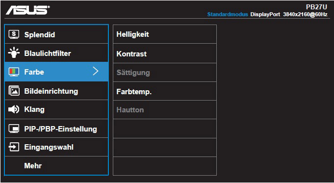 Das OSD wurde in acht Abschnitte eingeteilt, die teilweise aber kaum Funktionen anbieten. So kann beim Reiter „Blaulichtfilter“ zum Beispiel nur die Stärke der Anwendung und beim Klang nur die Lautstärke und die Quelle festgelegt werden.