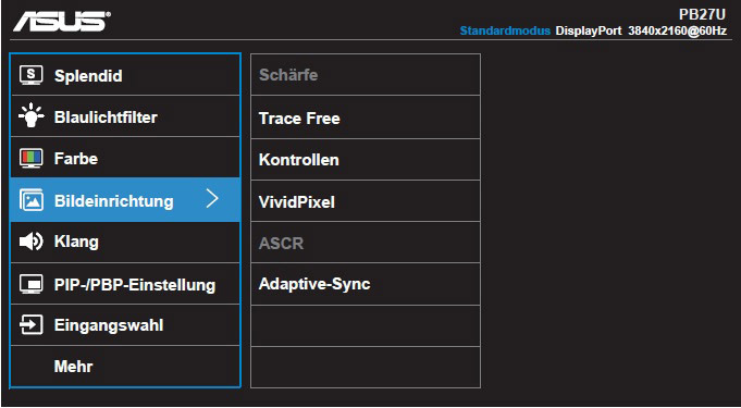 Die üblichen Farb- und Bildeinstellungen sind im dritten und vierten Reiter zu finden. Einstellbar sind dort die Helligkeit, der Kontrast, die Sättigung, die Farbtemperatur und der Hautton. Der andere Reiter bietet Einstellmöglichkeiten für die Schärfe, den Overdrive („Trace Free“), das Seitenverhältnis (Kontrollen), den VividPixel-Modus, den dynamischen Kontrast (ASCR) und den Adaptive-Sync-Modus an.