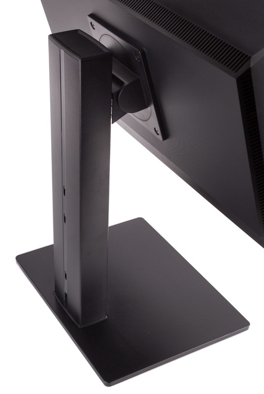 Der Standfuß ist ausreichend groß dimensioniert worden, wodurch das Gerät sicher am Platz gehalten wird. Es werden zudem viele Verstellmöglichkeiten angeboten, unter anderem ist auch ein Betrieb im Pivot-Modus möglich.