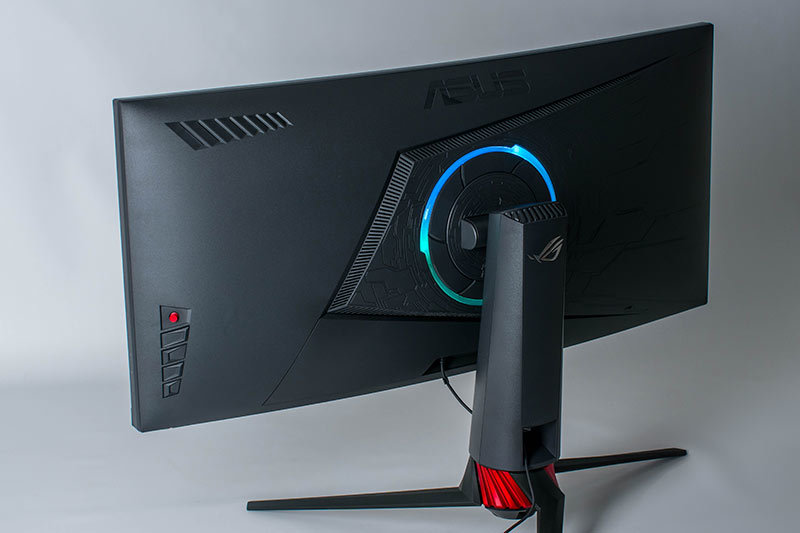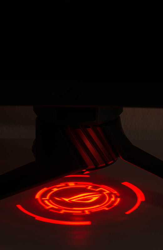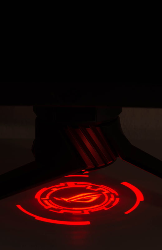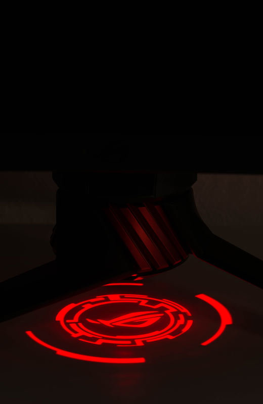 Wie alle ROG-Displays im Look „ROG Armor Titanium“ und „Plasma Copper“ sind unter dem Monitorarm LEDs angebracht. Über die Projektionsabdeckung kann entweder das beiliegende ROG-Logo oder ein selbstentworfenes Logo in Rot und in drei Helligkeitsstufen mittels „Light in Motion“ auf die Standfläche projiziert werden.