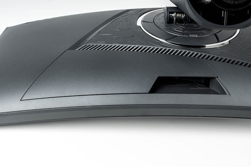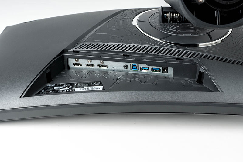 Wie bei allen neuen ROG-Geräten befindet sich das Anschluss-Panel hinter einer Blende. Das Anschließen der Kabel ist aufgrund des fehlenden Pivot-Modus und der vertikalen Steckrichtung ein mühsamer Akt. Aus diesem Grund werden die beiden USB-Anschlüsse von vielen Nutzern bestimmt wenig Zuspruch erhalten und selten zum Einsatz kommen. Ein seitlicher USB-Hub wäre hier durchaus sinnvoll gewesen und hätte bestimmt fantasievoll in das Design eingearbeitet werden können. Die zuletzt aufgesetzte Blende verfügt über ein Fenster, durch das die gesamten Kabel durchgeführt werden.