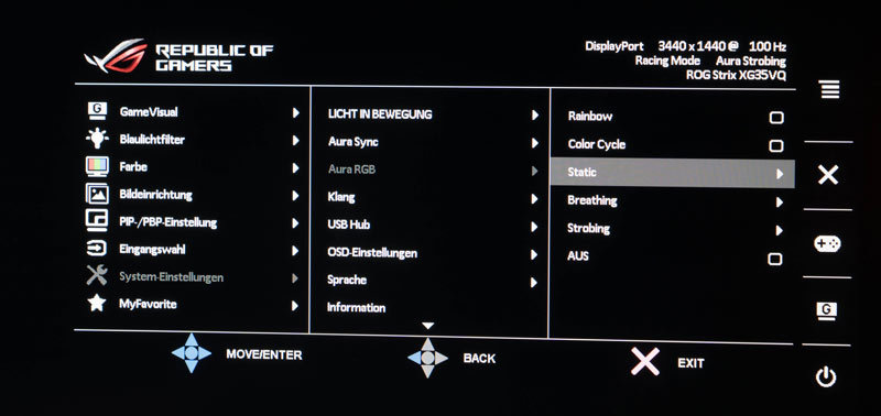 Die Effektauswahl wurde mittlerweile erweitert und zeigt bei den neuesten ROG-Displays zusätzlich Aura-RGB. Hier kann bei den Strix-Modellen der auf der Rückseite chromfarben erscheinende Ring in verschiedener Art beleuchtet werden.