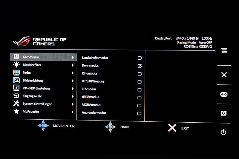 Die Möglichkeiten, das Bild an die eigenen Wünsche anzupassen, sind mehr als umfangreich. Wie auch beim ASUS ROG Strix XG27VQ lassen sich die voreingestellten GameVisual-Einstellungen bis auf den sRGB-Modus komplett anpassen und erhalten die Einstellungen, bis ein Werks-Reset gemacht wird. Damit stehen inklusive der vier dedizierten Speicherplätze unter „MyFavorite“ satte elf Plätze zur Verfügung, die in dieser Anzahl wahrscheinlich niemand nutzen wird.