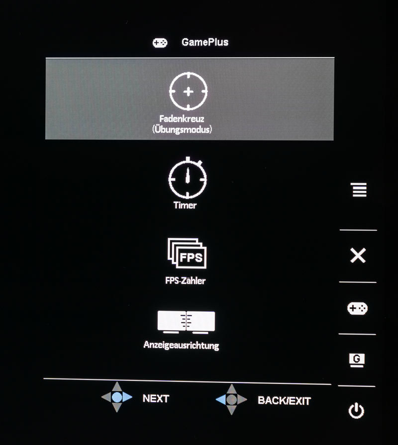 Die Tastenbelegung darunter beginnt mit der Verlassen-Taste. Durch sie kann das Menü mit einem Druck verlassen werden. Wichtig wird sie, wenn ein Tool aus dem GamePlus-Menü ausgewählt wird, da das Tool einzig mit dieser Taste verlassen werden kann. Die Taste darunter öffnet das GamePlus-Menü, dessen Auswahl allerdings wieder mit dem Joystick getroffen werden muss. Die dritte Taste von oben ist der Hotkey für das GameVisual-Menü und bietet die acht vordefinierten Bildmodi an. Die unterste Taste dient schließlich dem Ausschalten des Monitors. Da sie sich von der Entfernung nicht von den anderen Tasten unterscheidet, kann über das OSD-Menü eine Ein-/Aus-Tasten-Sperre aktiviert werden. Auch die Betriebs-LED kann dort deaktiviert werden.