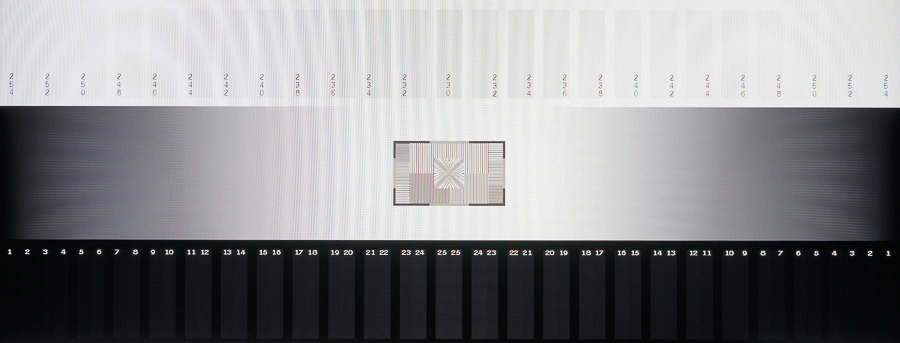 Die Graustufen (Streifen oben und unten in der Abbildung) können in den hellsten und dunkelsten Stufen vollständig differenziert werden. Daran ändert sich auch bei stärker seitlichen Blickwinkeln nichts. Allerdings fällt hier die Blickwinkel-Abhängigkeit bereits bei normaler Sitzposition auf, da sich dunkle Bereiche sehr schnell deutlich aufhellen. Schaut man lotrecht auf den rechten oder linken Bildschirmrand, wirken die Stufen 1-7 deutlich dunkler als bei zentrierter Sitzposition.