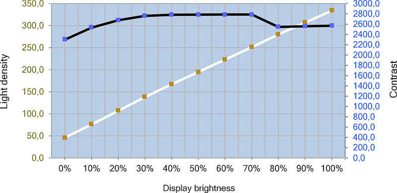 Mit nativem Weißpunkt erreichen wir im Maximum rund 337 cd/m². Das liegt sogar 12 % über der Herstellerangabe von 300 cd/m². Herunterregeln lässt sich die Helligkeit auf ein Minimum von 47 cd/m².
