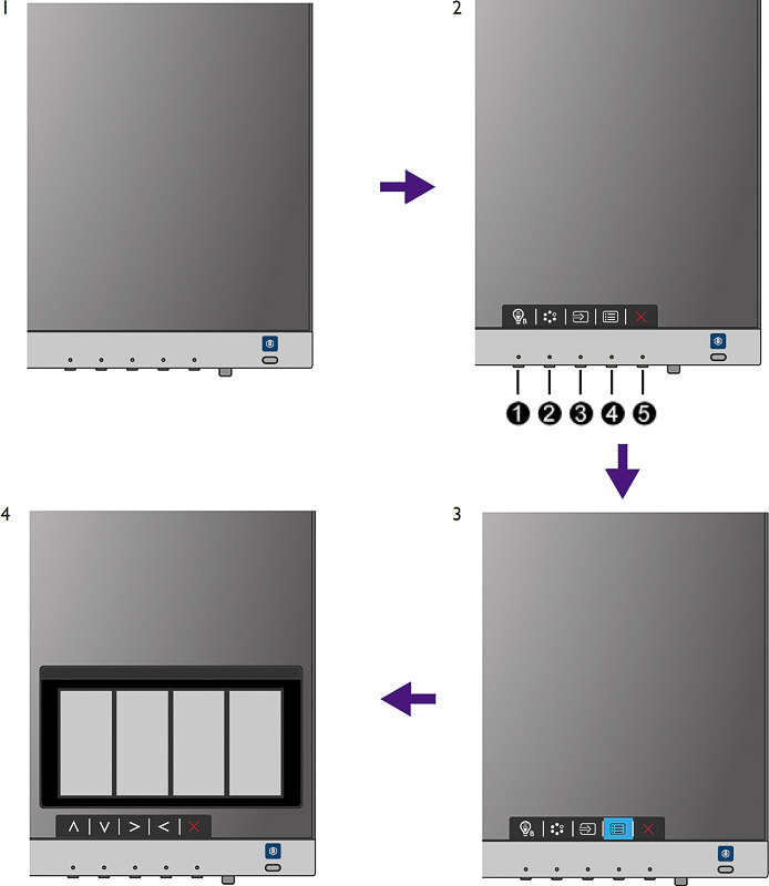 Ein beliebiger Tastendruck auf eine der Multifunktionstasten führt zunächst zu einer Schnellauswahl, deren Funktionen direkt über den Tasten angezeigt werden. Einstellungen zu Farbmodus, Quellwahl und Blue-Light-Filter lassen sich so ohne Umweg über das Menü erledigen.