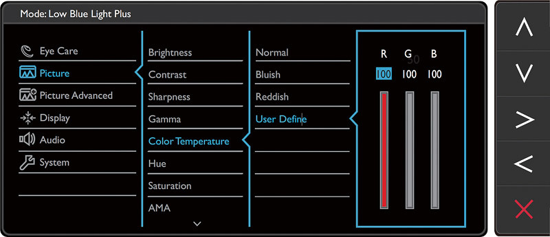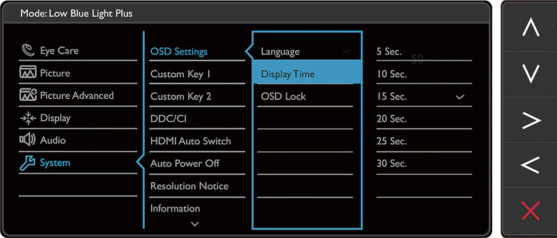 Das OSD ist umfangreich und weitgehend selbsterklärend. Die Funktionen sind auf sechs Hauptebenen verteilt. Neu hinzugekommen ist der Bereich „Eye Care“, in dem „Low Blue Light“ und BI+ konfiguriert werden können.