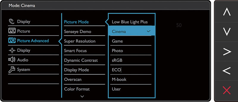 Wählt man eine Hauptebene aus, erscheinen die entsprechenden Unterpunkte in der Mittelspalte und in der Spalte rechts die dazugehörigen Detaileinstellungen. Der Sinn der Ebene „Bild erweitert“ bzw. „Picture Advanced“ erschließt sich nicht so ganz. Der Display-Mode (Auswahl des Seitenverhältnisses) gehört sprachlich wie logisch zum Hauptpunkt „Display“. Der Bildmodus als grundlegende Einstellung wäre in den normalen Einstellungen besser aufgehoben, und die restlichen Unterpunkte hätten dann dort auch noch Platz.