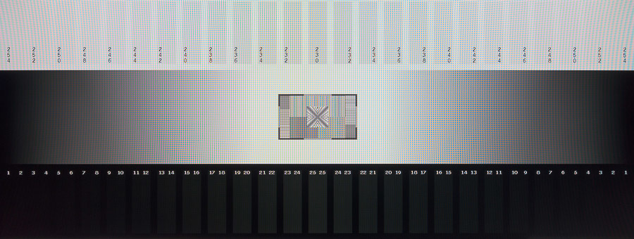 Bei der Graustufendarstellung schneidet der SW2700PT gut ab: Die hellsten Stufen sind vollständig zu erkennen. Nur die drei dunkelsten Stufen werden abgeschnitten. Bei den dunkelsten Stufen ist allerdings eine gewisse Blickwinkelabhängigkeit zu erkennen. Während auch extremere horizontale Blickwinkel kaum eine Rolle spielen, reichen bereits kleinere Veränderungen in der Vertikalen, um eine deutliche Aufhellung mit entsprechendem Verlust der Detailzeichnung auszumachen.