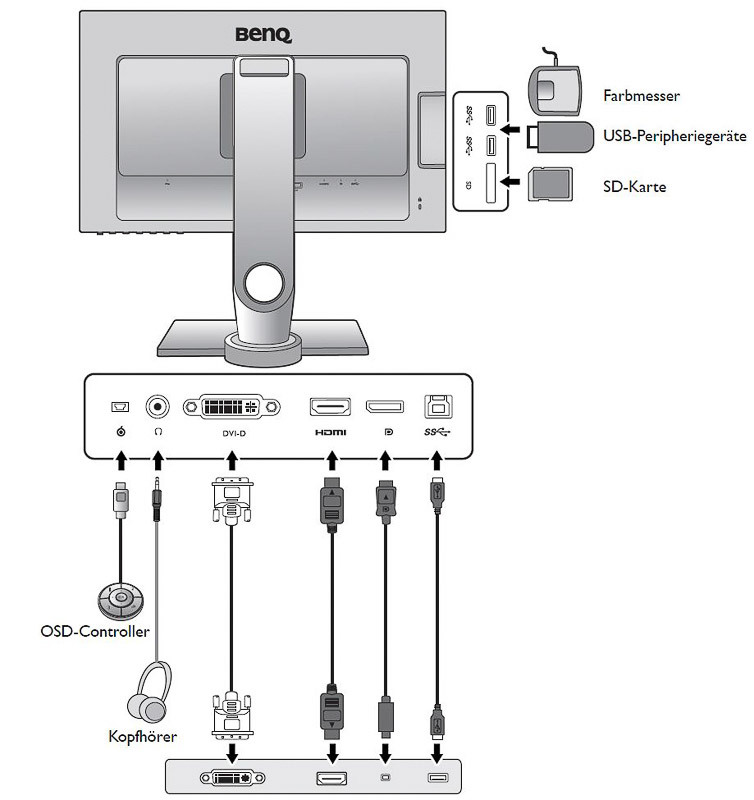 Ein USB-3.0-HUB ist ebenfalls vorhanden. Die beiden Ports liegen zusammen mit einem integrierten SD-/SDHC-/SDXC-Card-Reader gut zugänglich auf der linken Seite im Display-Rahmen. Professionelle Kameras setzen allerdings überwiegend auf CompactFlash- oder künftig auf XQD-Karten etc. Insofern ist der Kartenleser eher für Amateure von Nutzen.
