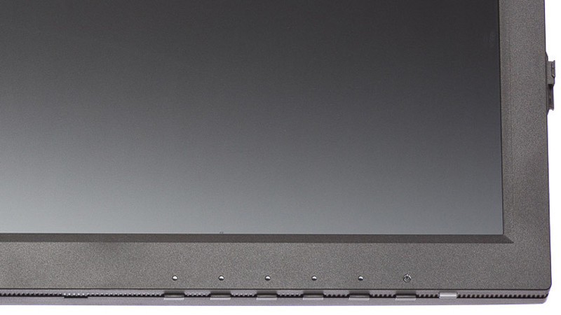 Sowohl der Panel-Rahmen als auch die Oberfläche des Panels sind matt und wirksam entspiegelt. Seitlich einfallendes Licht oder auch ein Betrachter mit heller Kleidung erzeugt nur schwache Reflexionen auf dem Bildschirm. Mit aufgesetzter Monitorblende werden diese zudem perfekt abgeschirmt. Schade ist nur, dass die Monitorblende selbst – wie bereits beschrieben – im oberen Bereich für störende Reflexionen sorgt.