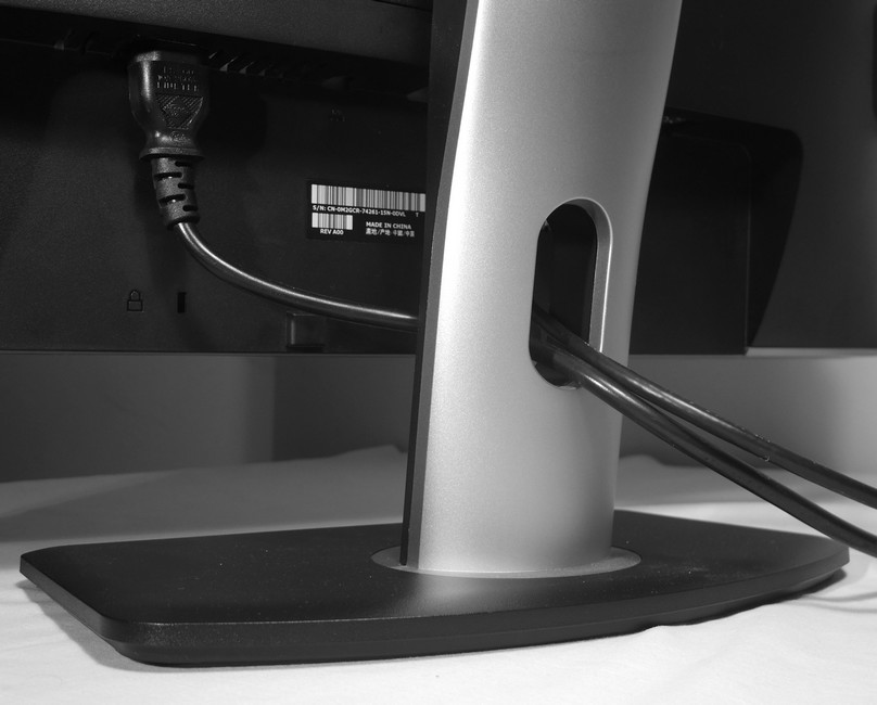 Der Standfuß bietet eine länglich ovale Aussparung, als einfache aber zweckmäßige Kabelführung. Man sollte jedoch beim Verstellen des Displays aufpassen, dass die Kabel sich nicht verklemmen und damit eine Zugbelastung auf die Anschlussbuchsen vermieden wird.