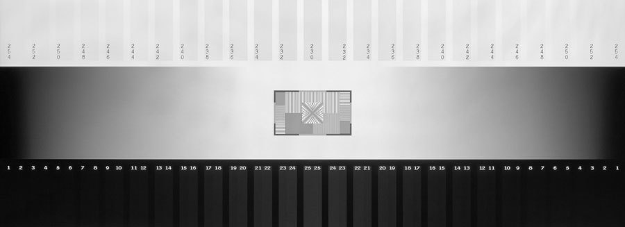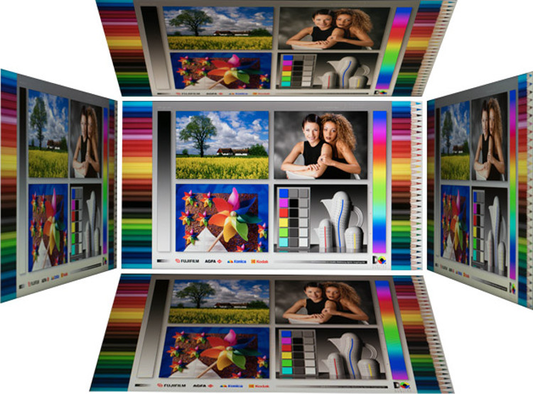 Wir untersuchen die Bildhomogenität anhand von vier Testbildern (Weiß, Neutraltöne mit 75 %, 50 %, 25 % Helligkeit), die wir an 15 Punkten vermessen. Daraus resultieren die gemittelte Helligkeitsabweichung in Prozent und das ebenfalls gemittelte Delta C (d. h. die Buntheitsdifferenz) in Bezug auf den jeweils zentral gemessenen Wert.