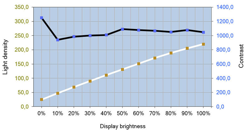 Das durchschnittliche Kontrastverhältnis liegt bei sehr guten 1054:1. Im Rahmen der Messgenauigkeit wird bei 0 Prozent Helligkeit sogar ein Kontrastverhältnis von 1250:1 erreicht. Nach der Kalibrierung verliert das Kontrastverhältnis nur wenig und erreicht immer noch sehr gute 1045:1.