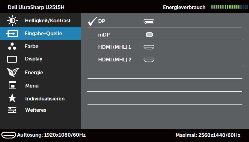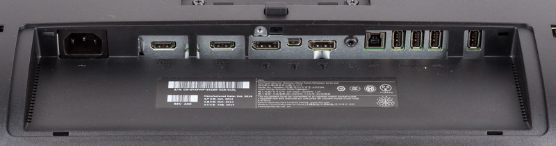 Ganz außen links wurde der Stromanschluss platziert. Vorhanden sind außerdem zwei HDMI-Anschlüsse (MHL), ein DisplayPort, ein miniDisplayPort, ein DisplayPort-Ausgang, ein Audioausgang und vier USB-3.0-Anschlüsse. Der DisplayPort-Ausgang kann verwendet werden, um einen weiteren Monitor anzuschließen, ohne einen zusätzlichen Port der Grafikkarte belegen zu müssen. Die anderen Anschlüsse können nicht parallel verwendet werden, da das Gerät leider keinen PiP- oder PbP-Modus anbietet.
