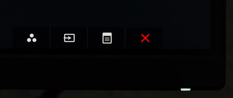 Unten rechts auf dem Frontrahmen befinden sich vier Touch-Tasten zur Steuerung des OSDs sowie der Power-Knopf, der ebenfalls auf die Touch-Technologie setzt. Die Punkte auf dem Rahmen, die die Touch-Taste markieren, wurden sehr dezent aufgebracht, so dass sie schon in leicht abgedunkelten Räumen nicht mehr zu erkennen sind. Beleuchtet sind die Tasten ebenfalls nicht; auch nicht, wenn mit der Hand vor die Tasten gegriffen wird, wie es bei einigen Konkurrenzprodukten der Fall ist.