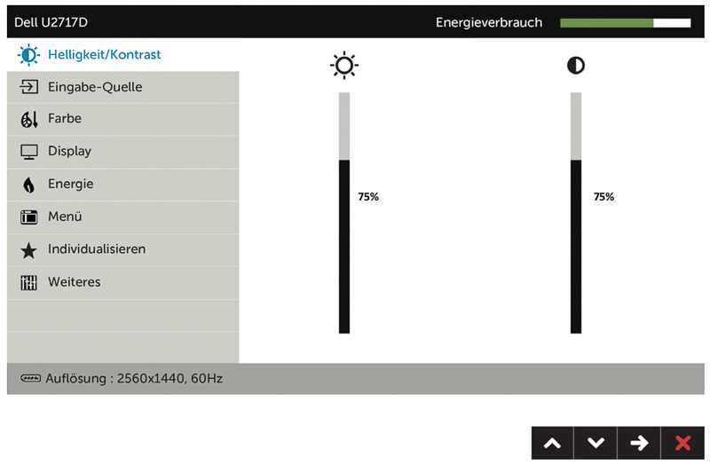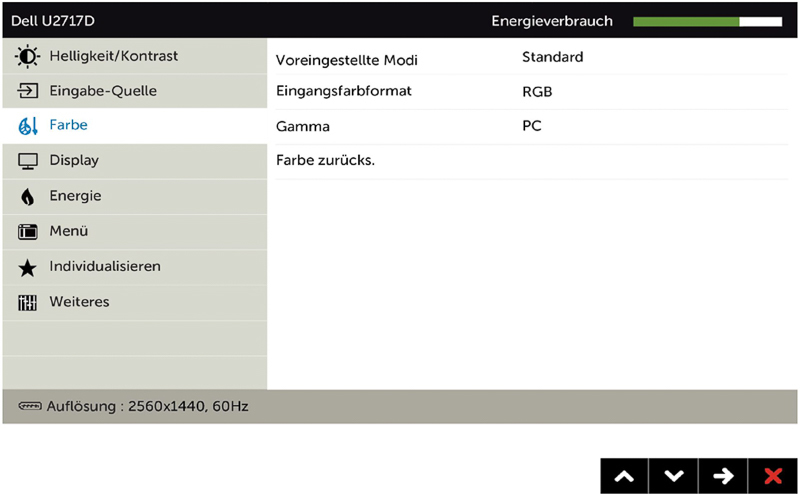 Die Bedienung erfolgt über fünf Tasten auf der Rahmenunterseite rechts. Die Tasten haben einen klaren Druckpunkt, sind aber etwas klein und schwergängig. Angenehm ist dagegen, dass das Display dennoch auch bei der Bedienung stabil bleibt. Bei manch anderen Geräten führt jede Berührung des Displays zu langem Nachwackeln – nicht so beim Dell U2717D.