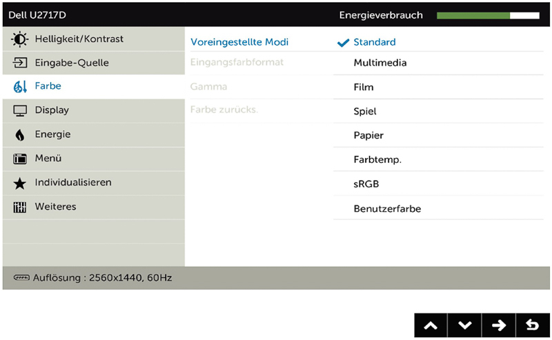 Das OSD des Dell U2717D ist kurz gesagt vorbildlich. Der Druck auf eine beliebige der vier Multifunktionstasten bringt das Grundmenü zum Vorschein. Damit hat man Schnellauswahlmöglichkeiten für die Wahl von Eingangsquelle und Bildmodus oder kann in das eigentliche Menü wechseln.
