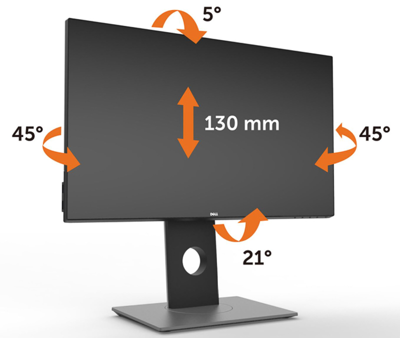 Hinsichtlich Ergonomie bietet der Dell U2717D alles, was das Herz begehrt: 13 Zentimeter Höhenverstellung, 45°-Drehung nach links und rechts, schwenkbar von -5° bis +21°. Selbstverständlich ist auch eine Pivotfunktion für das Hochformat vorhanden.