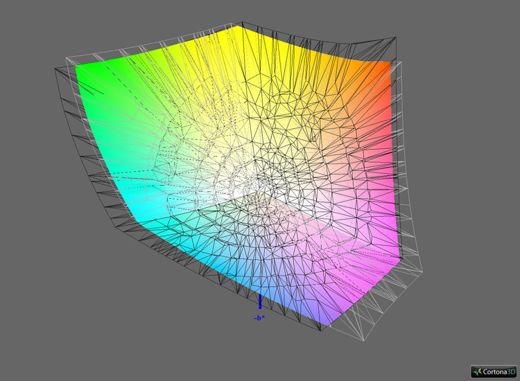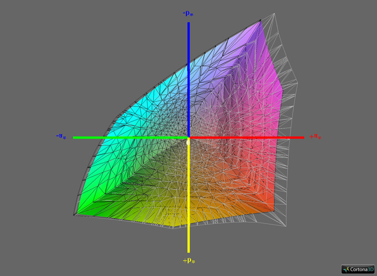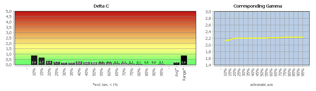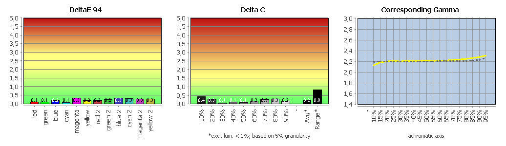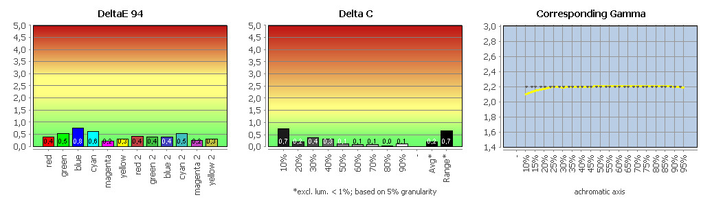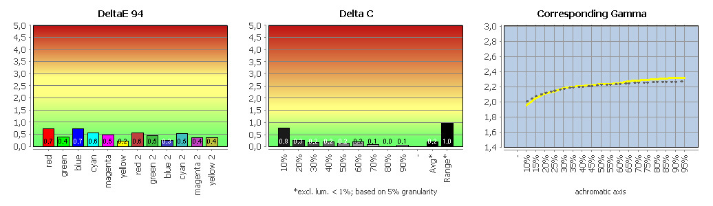 Geringe Abweichungen in den bunten Farben zeugen von präzisen Farbraumtransformationen. Entsprechende Inhalte können damit bereits ohne weitere Maßnahmen sehr ansprechend auch in nicht Farbmanagement-fähigen Anwendungen wiedergegeben werden. Die Graubalance ist nach wie vor einwandfrei.