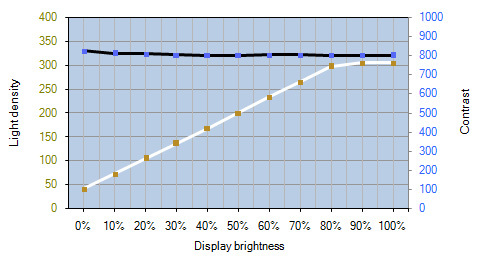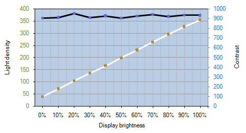 Mit abgeschwächtem Flächenabgleich (DUE Priority: Brightness) erreichen wir eine maximale Leuchtdichte von knapp 360 cd/m². Das liegt im Bereich der Werksangabe und korreliert mit der entsprechenden Auswahl im OSD. Auch ein über die gesamte Helligkeitsspannbreite stabiles Kontrastverhältnis von gut 920:1 ist ordentlich.