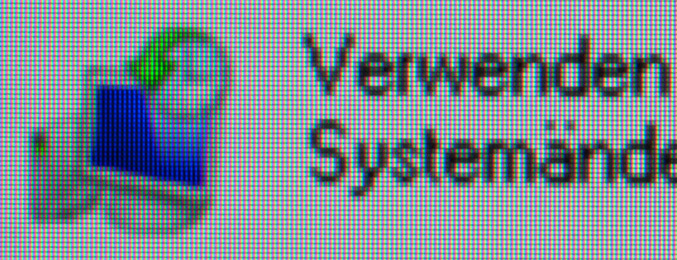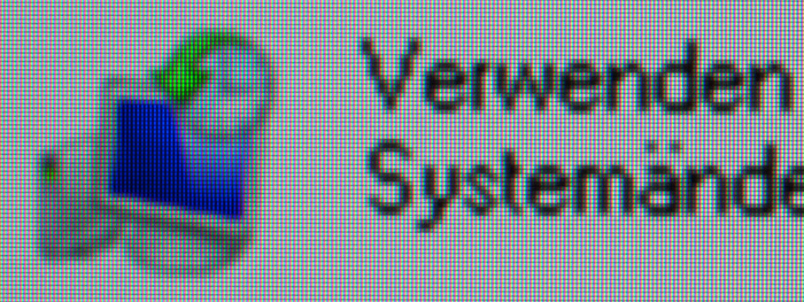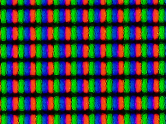 Ein mikroskopischer Blick auf die Subpixel, mit Fokus auf die Bildschirmoberfläche: Der EIZO CG2730 besitzt eine stumpf-matte Oberfläche mit mikroskopisch sichtbaren Vertiefungen zur Diffusion. Körnungs- beziehungsweise Glitzereffekte bleiben fast vollständig aus.