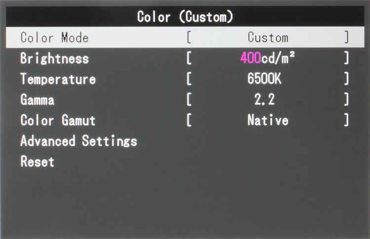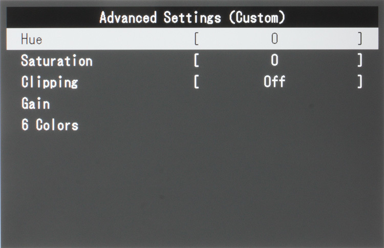 Über einen Helligkeitsregler wird die Intensität der Hintergrundbeleuchtung verändert. Der gewünschte Weißpunkt kann über Voreinstellungen in Kelvin, drei RGB-Gain-Regler oder normative Vorgaben angepasst werden.