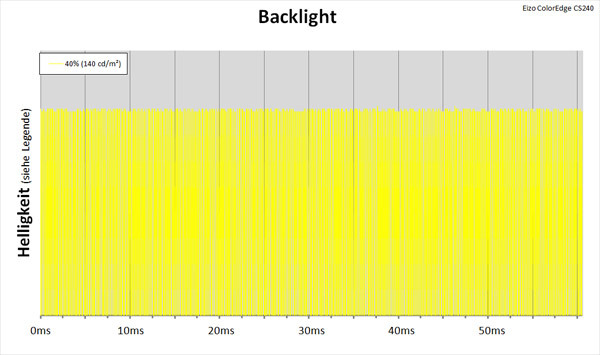 Die Hintergrundbeleuchtung des Eizo CS240 arbeitet mit GB-R-LED. Die Helligkeit wird mit dem verbreiteten PWM-Verfahren (Pulsweitenmodulation) gesteuert. Nur bei 100 % Helligkeit leuchtet die Hintergrundbeleuchtung kontinuierlich.