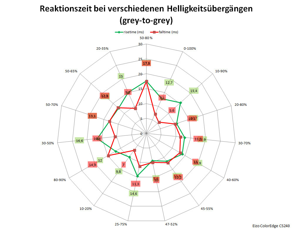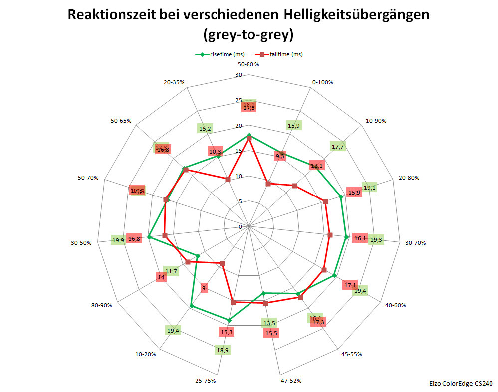 In den folgenden Netzdiagrammen sehen Sie alle Messwerte zu den unterschiedlichen Helligkeitssprüngen unserer Messungen im Überblick. Im Idealfall würden sich die grünen und roten Linien eng am Zentrum befinden. Jede Achse repräsentiert einen in dem Pegel und der Dynamik definierten Helligkeitssprung des Monitors, gemessen über Lichtsensor und Oszilloskop.