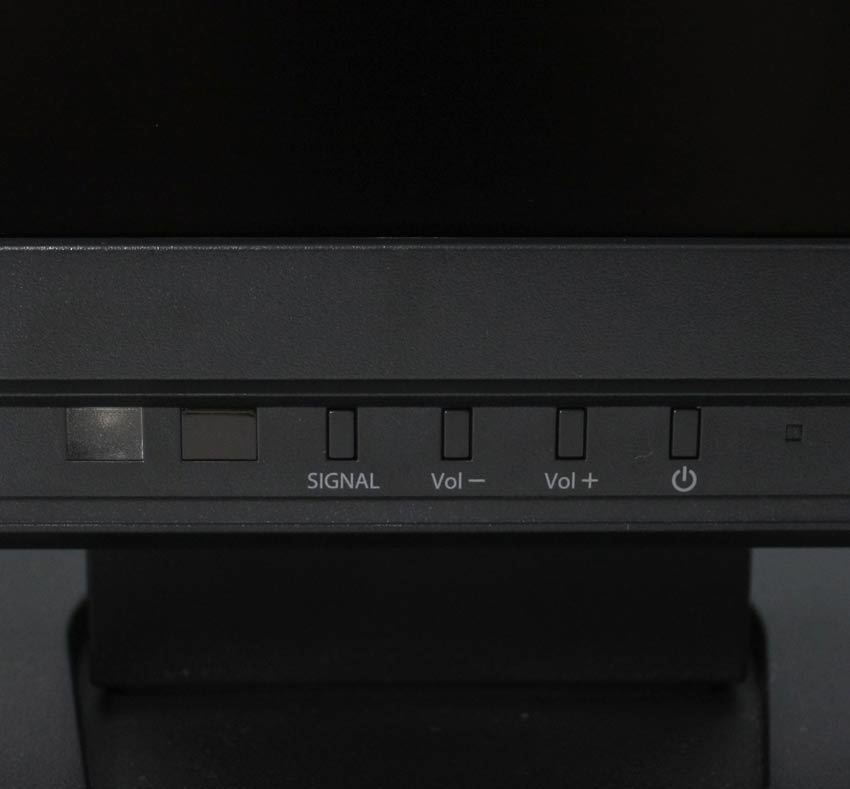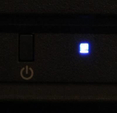 Die Power-LED des Eizo FS2333 befindet sich rechts neben der Powertaste. Sie ist mit etwa zwei Millimeter Seitenlänge sehr klein und leuchtet in Betrieb blau. Im Ruhemodus wechselt die Farbe auf orange und wird der Eizo FS2333 mit der Powertaste ausgeschalten, wechselt die Farbe noch einmal, dann auf rot.