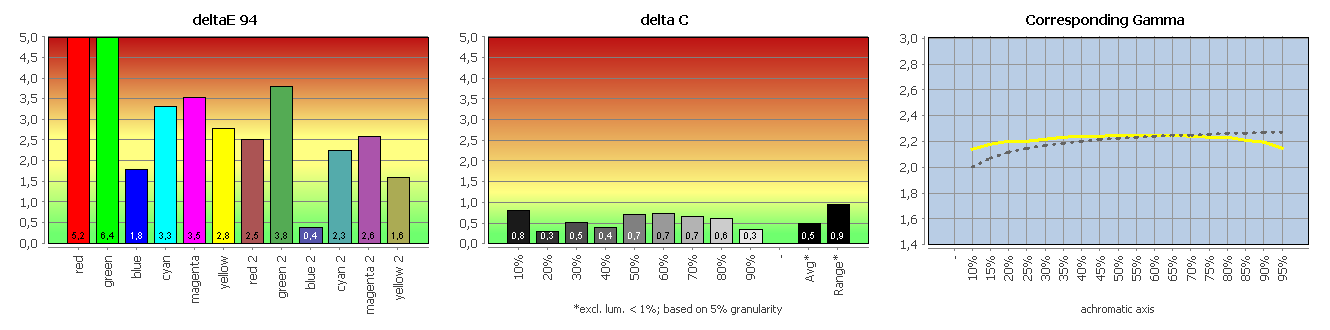 Die Erläuterungen zu den folgenden Charts haben wir hier zusammengefasst: DeltaE Abweichung für Farbwerte und Weißpunkt, DeltaC Abweichung für Grauwerte, und Gradation.