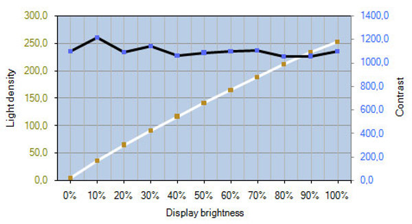 Ist der Helligkeitsregler auf 0 Prozent eingestellt, leuchtet die Hintergrundbeleuchtung nur noch mit 5,5 cd/m². Bei einer so niedrigen Helligkeit, ist das i1 Display Pro nicht mehr in der Lage den Schwarzpunkt zu erfassen. Um für die Berechnung des Kontrastwerts ein Ergebnis zu erhalten, haben wir daher den Schwarzpunkt mit 0,005 cd/m² gerechnet.