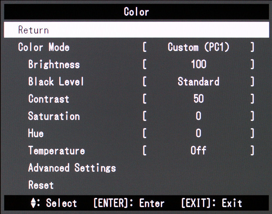 Das OSD ist übersichtlich und überwiegend intuitiv zu bedienen, wobei es gewöhnungsbedürftig ist, dass die Select-Taste nicht zum übergeordneten Menü wechselt, sondern gleich zur Input-Wahl springt und somit das OSD beendet. Eine Ebene zurück gelangt man nur, wenn man den Menüpunkt „Return“ mit Enter bestätigt.