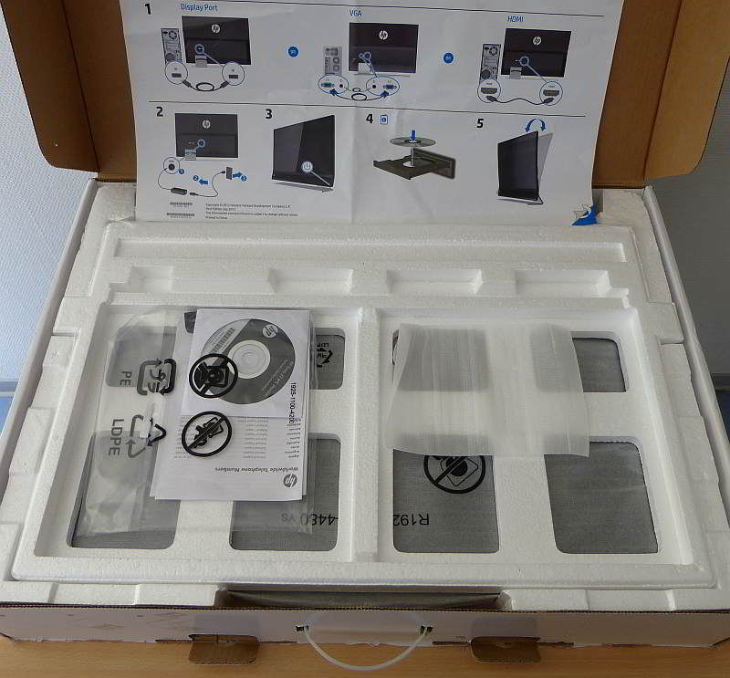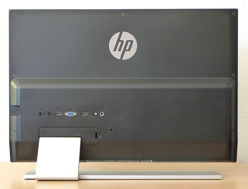 Aufgrund des verbauten IPS-Panels mit LED-Hintergrundbeleuchtung verspricht HP eine bessere Bildqualität, sowie konstanten Kontrast und Helligkeit über den gesamten Blickwinkel. Natürlich sind alle für einen Multimediamonitor notwendigen Anschlüsse wie HDMI mit HDCP, VGA und sogar ein DisplayPort-Anschluss vorhanden. Selbst die zugehörigen Kabel liegen bei, was nicht unbedingt selbstverständlich ist. Ein DVI-Anschluss ist jedoch nicht mehr vorgesehen.