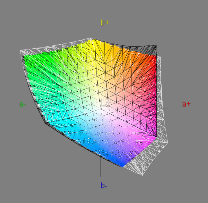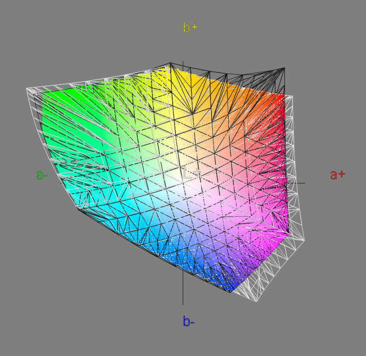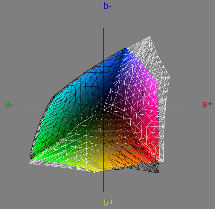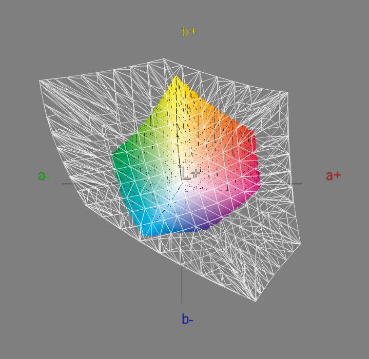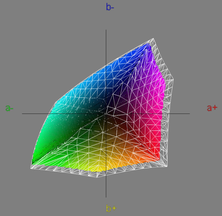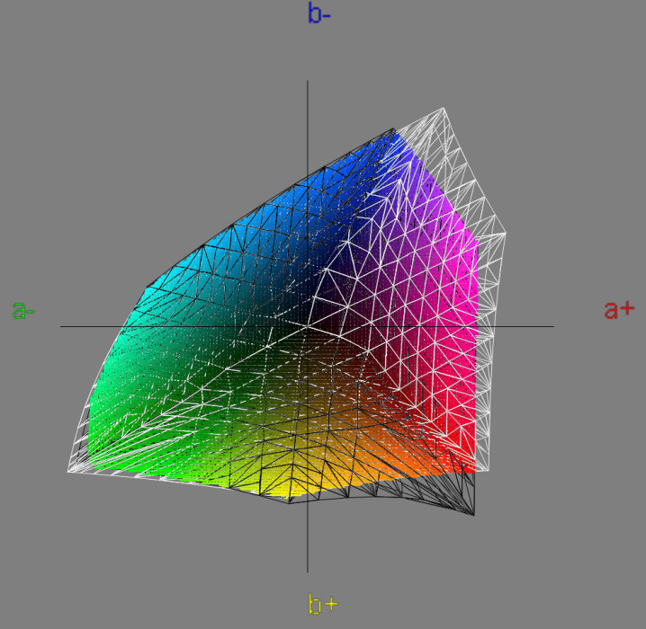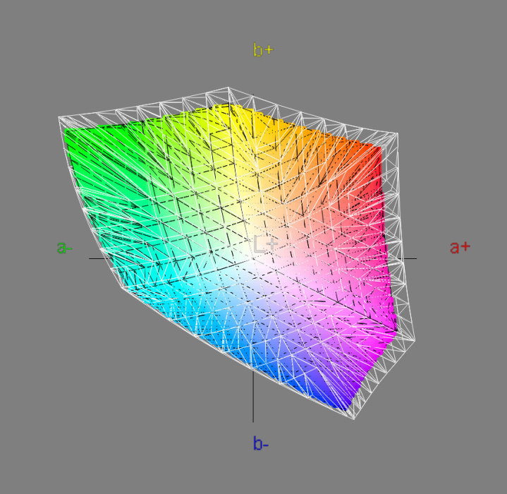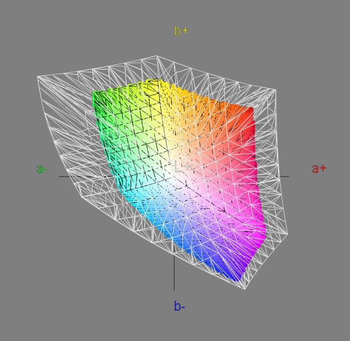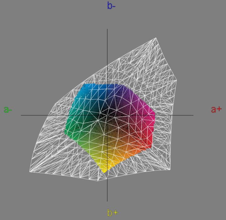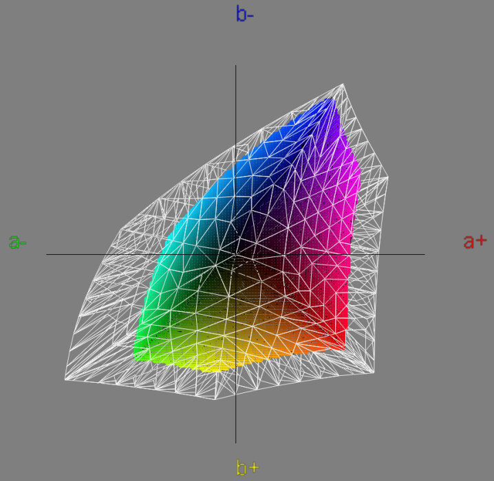 Zusammenfassend ist der riesige Farbraum allem Anschein nach als für AdobeRGB optimiert anzusehen, da er diesem am nächsten kommt und ihn obendrein vollständig abdecken kann.
