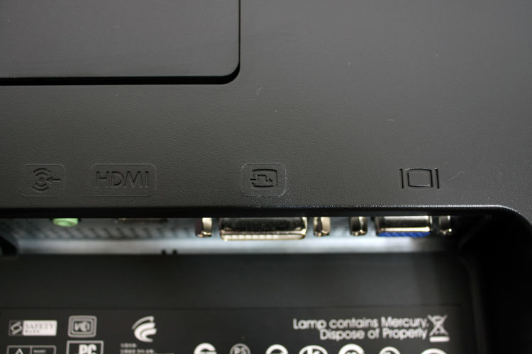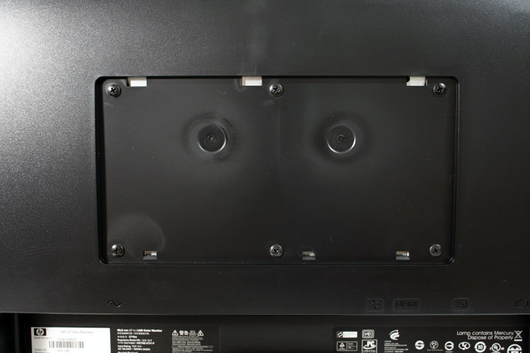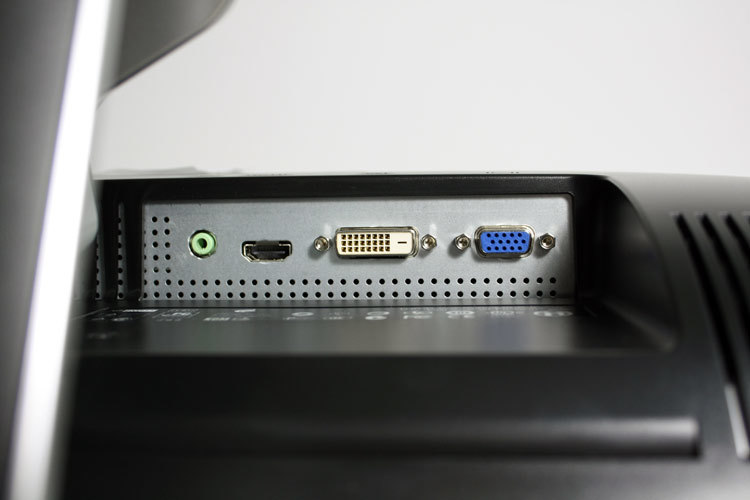 Die Anschlüsse des HP 2710m befinden sich wie bei Bildschirmen üblich auf der Rückseite und sind nach unten ausgerichtet. Neben einem D-Sub VGA Anschluss für analoge und DVI-D Eingang für digitale Signalzuspielung befindet sich auch noch ein HDMI Anschluss. Dadurch wird der HP 2710m zum Multimediagerät und bietet auch externen Zuspielgeräten wie Blu-ray Player oder Spielekonsole eine Anschlussmöglichkeit. Die integrierten Lautsprecher können entweder über HDMI oder den 3,5 mm Klinkenstecker angesteuert werden. Piktogramme symbolisieren wo sich welche Schnittstelle befindet, da sie aber nur eingraviert sind, können sie bei dämmriger Beleuchtung kaum vom Hintergrund unterschieden werden.