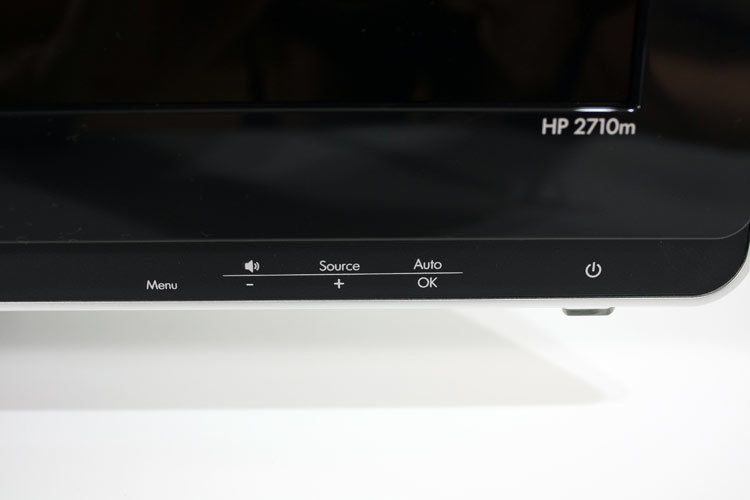 Am unteren rechten Gehäuserand sind die Bedientasten des HP 2710m platziert. Betätigt werden sie von unten nach oben und sind dadurch, mit Ausnahme der Powertaste, von vorne nicht zu sehen. Der Druckpunkt ist gut, die akustische Rückmeldung ist laut und klingt etwas blechern. Wie auch der HP ZR24w kommt auch der 2710m mit nur fünf Bedientasten aus. Ganz links befindet sich die Menütaste, welche das OSD öffnet. Mit der Minus- und Plustaste wird im OSD navigiert. Die OK-Taste bestätigt eine Auswahl im OSD und ganz rechts befindet sich noch die Powertaste. Bei geschlossenem OSD und drücken der Minustaste wird das „Lautstärke“ Untermenü geöffnet, mit der Plustaste gelangt man direkt in die Quellensteuerung.