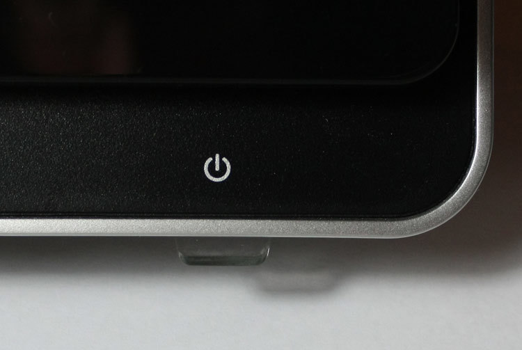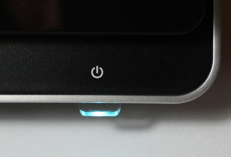Die Power LED ist gleichzeitig auch die Powertaste, deshalb etwas höher als die anderen Tasten und von vorne sichtbar. Sie ist fast 1,5 Zentimeter breit und leuchtet sehr hell. Im OSD des HP 2710m gibt es jedoch die Möglichkeit die Power LED zu deaktivieren. Auch im Ruhemodus leuchtet sie dann nicht mehr.