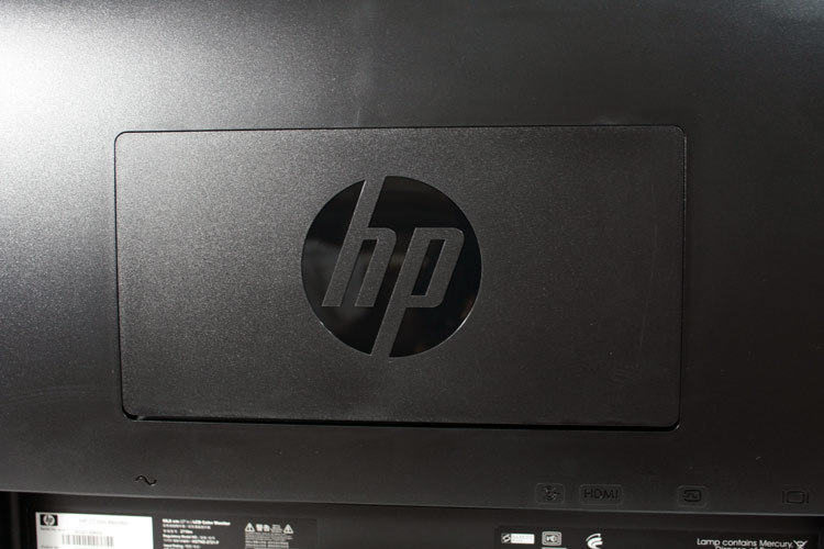 Die Rückseite des HP 2710m ist sehr schlicht. Mittig ist das HP Logo platziert und mit glänzendem Hintergrund optisch etwas hervorgehoben. Die Kunststoffplatte auf dem sich das HP Logo befindet lässt sich zwar abnehmen, aber leider finden wir auch dahinter keine VESA 100 Bohrung. Somit ist es dem HP 2710m nicht möglich alternative Befestigungsmöglichkeiten zu nutzen.
