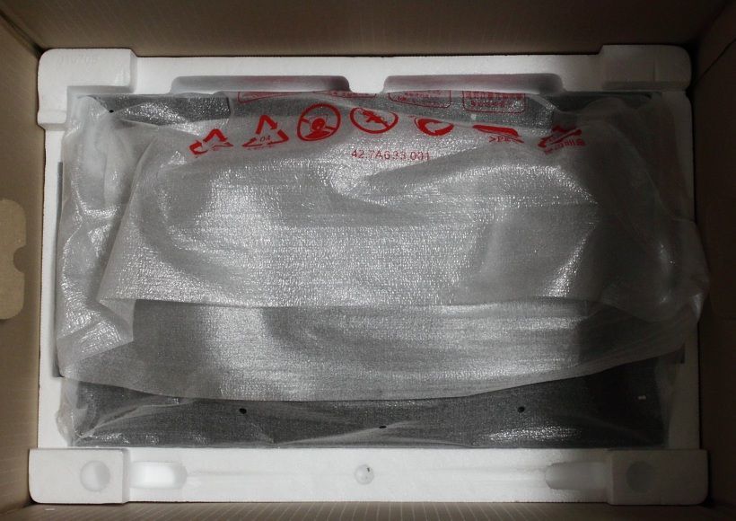 Das Zubehör und der Standfuß wurden im oberen Teil des Kartons positioniert, der eigentliche Monitor befand sich im unteren Teil zwischen zwei dicken Styroporteilen und ist daher gut geschützt.