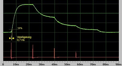 Erläuterung der Darstellung: Die Verzögerungszeit des LCD ergibt sich als die Zeitdifferenz zwischen dem Steuersignal (grün) und dem Aufleuchten des Pixels (10%-Schwelle, rote Kurve).