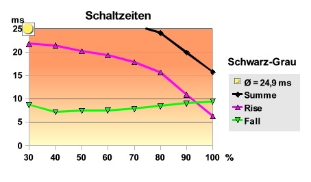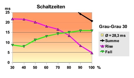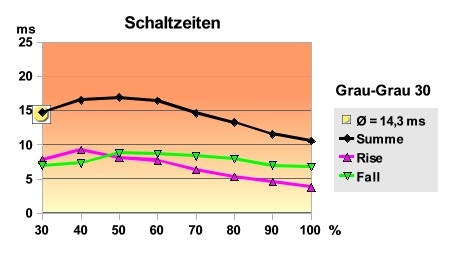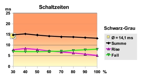 Erläuterung der Darstellung: Die erste Messreihe enthält die Zeiten für einen Wechsel von Schwarz zu Grauwerten zwischen 30 % (RGB 77) und 100 % (RGB 255 = Weiß, ISO 13406-2). Diese Reihe beschreibt das Verhalten bei starken Kontrasten. Die zweite Messreihe enthält die Zeiten für einen Wechsel zwischen zwei Graustufen, deren RGB-Werte jeweils um 30 Prozent auseinander liegen. Diese Reihe beschreibt das Verhalten bei geringen Kontrasten.