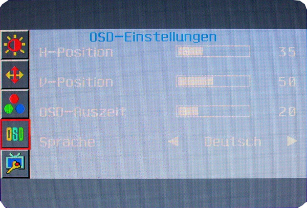 In den OSD-Einstellungen lässt sich das Menü beliebig auf der Bildfläche platzieren. Auch die Anzeigedauer kann unter dem Punkt „OSD-Anzeigezeit“ angepasst werden. Jeder Klick entspricht dabei einer Sekunde. Es stehen insgesamt neun Sprachen zur Verfügung.