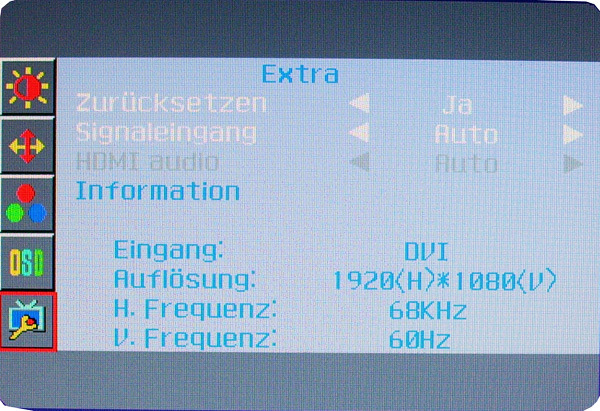 Der Menüpunkt EXTRA bietet die Möglichkeit, den Monitor wieder in den werksseitigen Zustand zurückzusetzen. Zudem lässt sich der Ton bei Nutzung des HDMI-Eingangs wahlweise ausschalten. Hellblau hervorgehoben werden im Menü noch einige nützliche Informationen wie gewählter Eingang, eingehende Auflösung und Horizontal- und Vertikalfrequenz angezeigt.