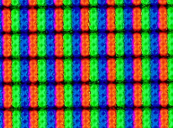 Mikroskopischer Blick auf die Subpixel, mit Fokus auf die Bildschirmoberfläche: Der Iiyama besitzt eine stumpf-matte Oberfläche mit mikroskopisch sichtbaren Vertiefungen zur Diffusion.