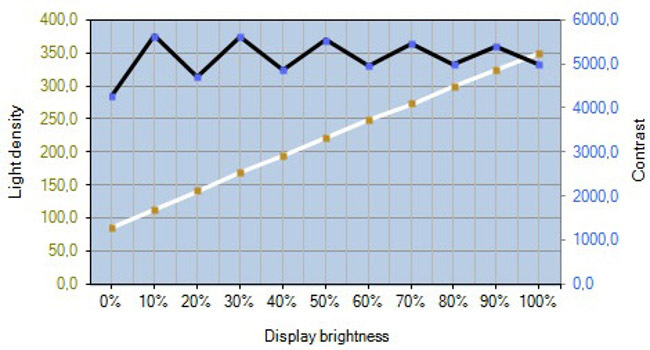 Der zackige Verlauf der Kontrastkurve ergibt sich durch unsere Messeinheit, die den Schwarzwert auf „nur“ zwei Stellen hinter dem Komma ausgeben kann. Wir gehen davon aus, dass bei feinerer Abstufung ebenfalls eine lineare Kurve zu sehen wäre. Verstecken muss sich das Gerät in diesem Bereich aber in keinem Fall, denn durchschnittlich konnten wir einen Kontrast von über 5000:1 messen.