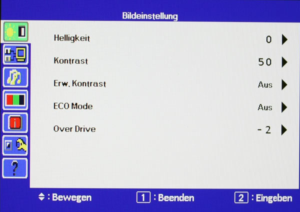 Grundsätzliche Bildeinstellungen wie Helligkeit, Kontrast usw. aber auch die Overdrive-Einstellung stehen in diesem Menü zur Verfügung.